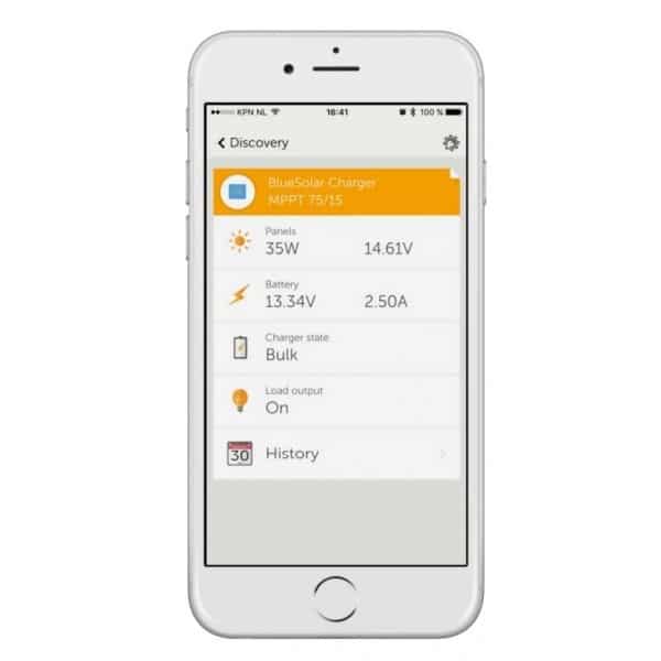 - En connectant votre téléphone ou tablette en BLUETOOTH au régulateur de charge VICTRON, vous pourrez visualiser en temps réel la puissance, la tension & l’intensité délivré par le panneau mais également paramétrer vos tensions de sortie en fonction de la technologie de votre parc à batterie.